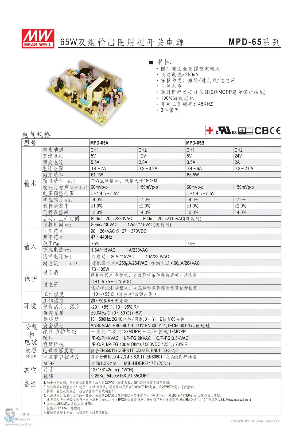 明緯開關電源MPD-65B 65W雙組輸出醫用PCB型