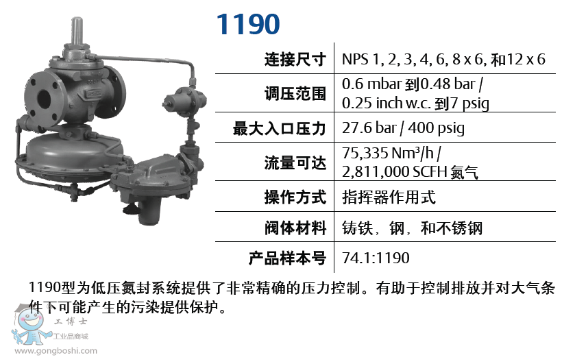 1190型為低壓氮封系統提供了非常精確的壓力控制。有助于控制排放并對大氣條件下可能產生的污染提供保護。
