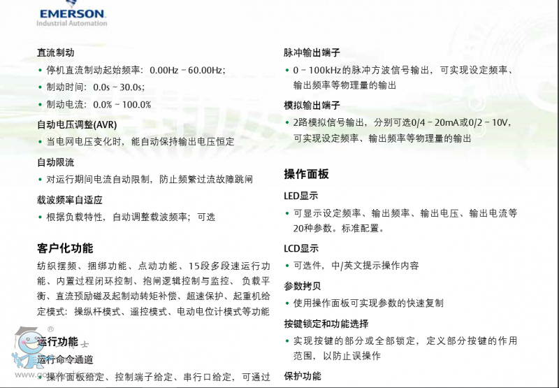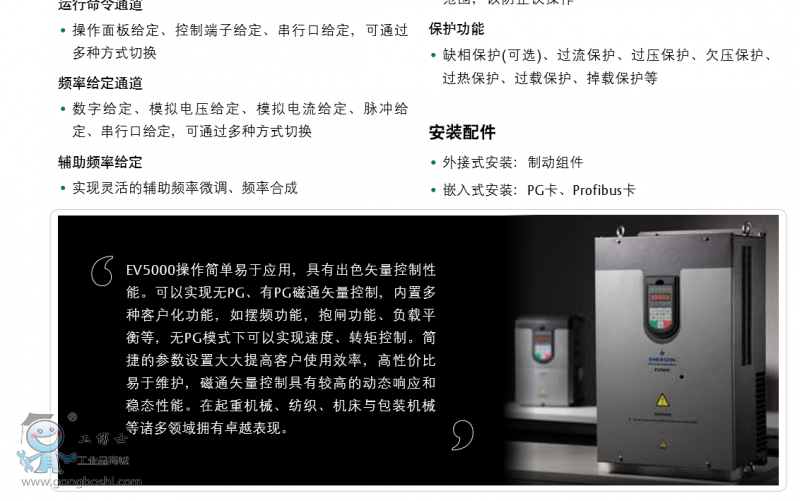 通用矢量控制變頻器 EV5000操作簡單易于應(yīng)用,具有出色矢量控制性能。 可以實(shí)現(xiàn)無PG、有PG磁通矢量控制,內(nèi)置多種客戶化 功能,如擺頻功能,抱閘功能、負(fù)載平衡等,無PG模式 下可以實(shí)現(xiàn)速度、轉(zhuǎn)矩控制。簡捷的參數(shù)設(shè)置大大提高 客戶使用效率,高性價(jià)比易于維護(hù),磁通矢量控制具有 較高的動(dòng)態(tài)響應(yīng)和穩(wěn)態(tài)性能。在起重機(jī)械、紡織、機(jī)床 與包裝機(jī)械等諸多領(lǐng)域擁有卓越表現(xiàn)。