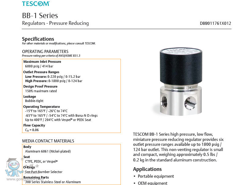 TESCOM BB-1 Series high pressure, low flow, miniature pressure reducing regulator provides six outlet pressure ranges available up to 1800 psig /124 bar outlet. This non-venting regulator is small and compact, weighing approximately 0.5 lbs /