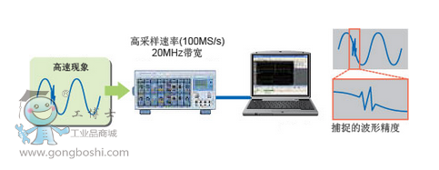 在高速波形測量中,YOKOGAWA提供了*大采樣率為100MS/s(10ns采樣間隔)的測量儀器。通過新開發(fā)的100MS/s、12位分辨率、20MHz頻率范圍、1-kV*絕緣模塊(720210),SL1000能夠精確捕捉高速、高電壓信號。