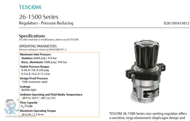 TESCOM 26-1500 Series non-venting regulator offers a sensitive, large elastomeric diaphragm design and precision outlet pressure control.