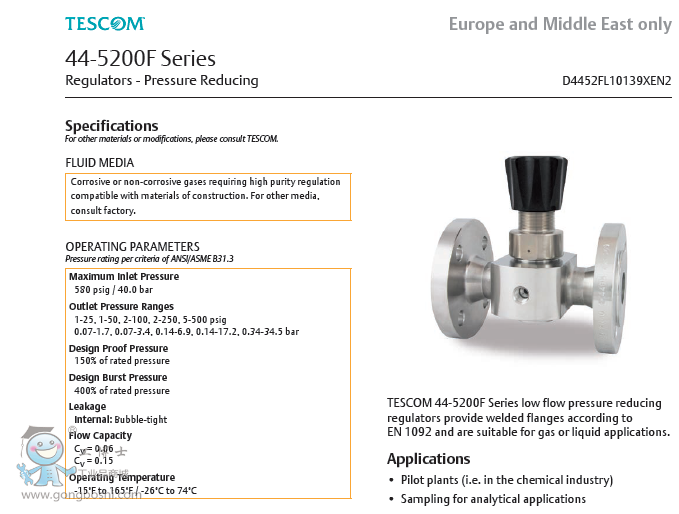 TESCOM 44-5200F Series low flow pressure reducing regulators provide welded flanges according to EN 1092 and are suitable for gas or liquid applications.