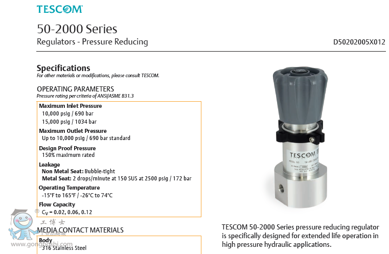TESCOM 50-2000 Series pressure reducing regulator is specifically designed for extended life operation in high pressure hydraulic applications.