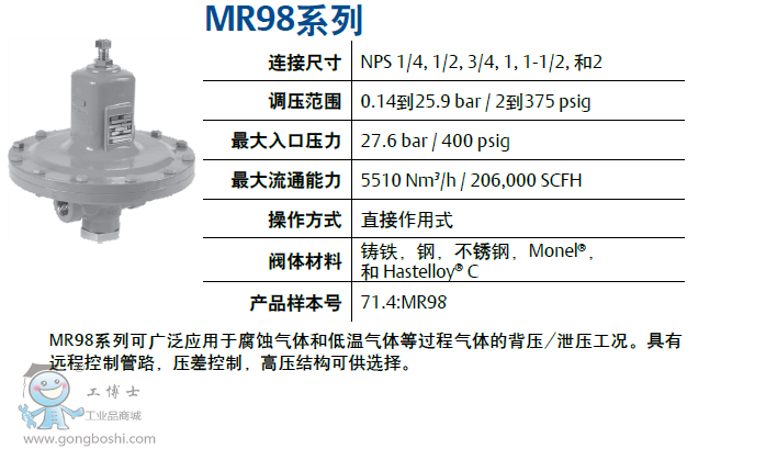 MR98系列可廣泛應用于腐蝕氣體和低溫氣體等過程氣體的背壓/泄壓工況。具有遠程控制管路,壓差控制,高壓結構可供選擇。