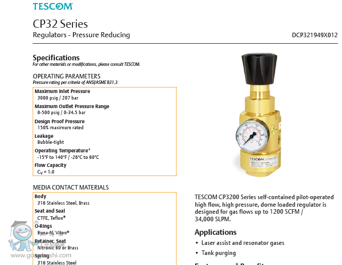 TESCOM CP3200 Series self-contained pilot-operated high flow, high pressure, dome loaded regulator is designed for gas flows up to 1200 SCFM /34,000 SLPM.