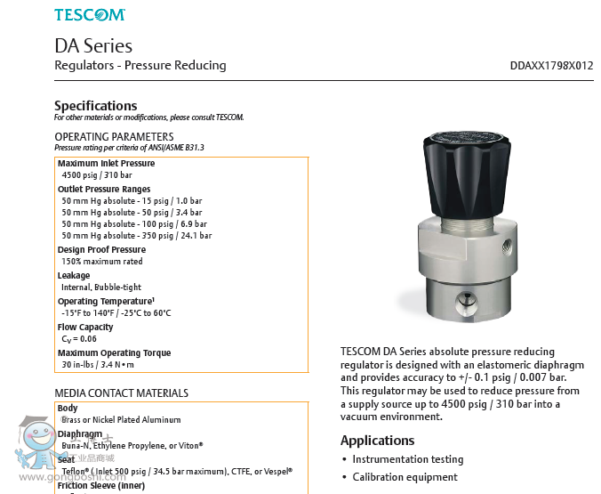 TESCOM DA Series absolute pressure reducing regulator is designed with an elastomeric diaphragm