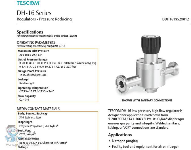 5-200 SCFM / 141-5663 SLPM. Its Gylon® diaphragm ensures gas purity and integrity. Welded sanitary,