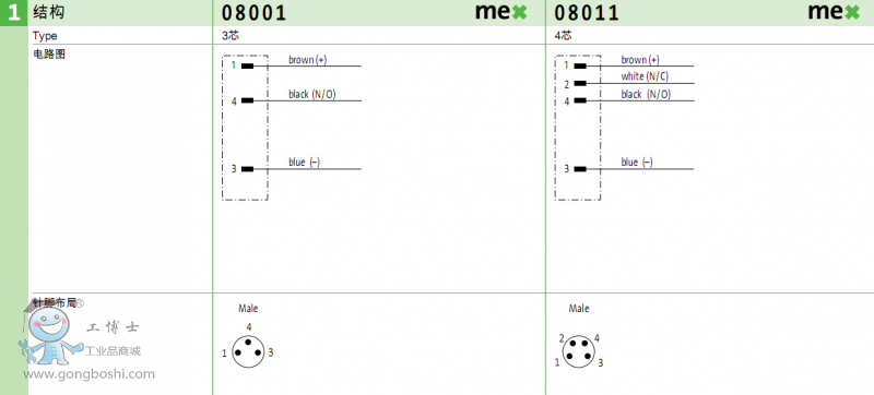 第1組數(shù)字 連接器類(lèi)型 12401 代表M12母頭90°配LED指示燈,4針