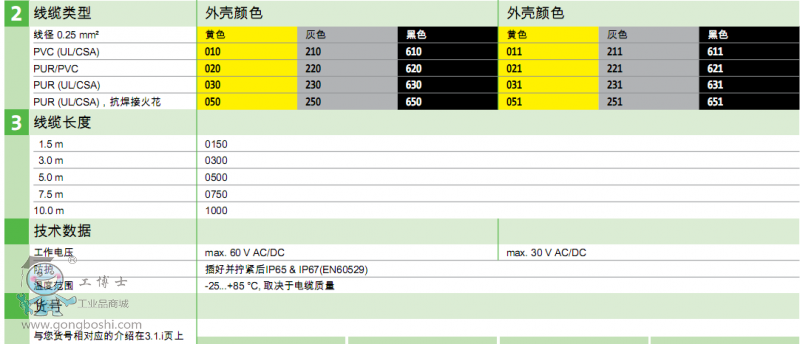 第2組數(shù)字 護(hù)套線材料/顏色 033 代表PUR(UL/CSA),黃色