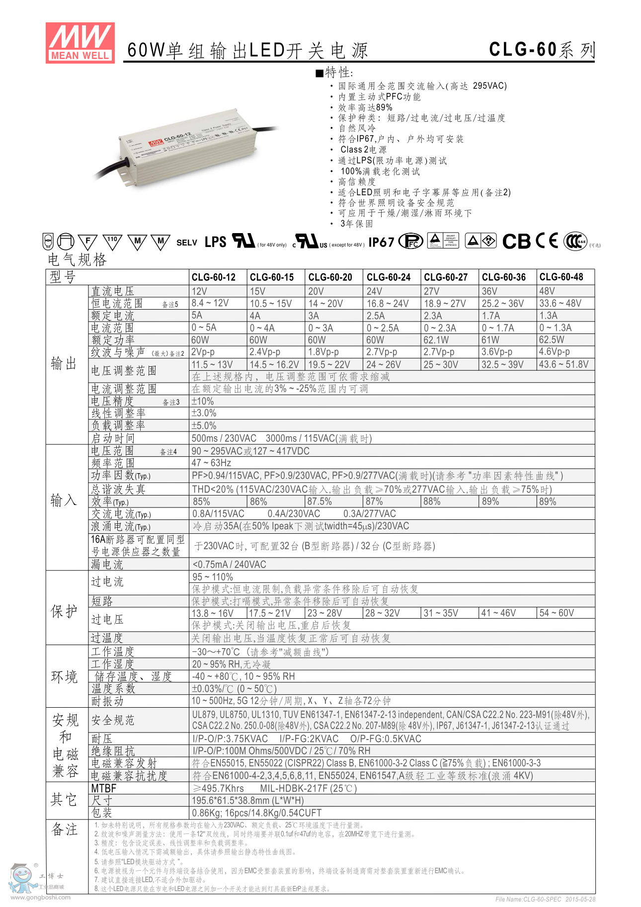 功能特性 • 90~295VAC交流輸入,內建主動式功率因子矯正功能(active PFC)