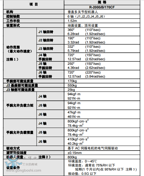發那科R-2000iB/170CF負載170kg6軸范圍1520mm精度±0.15mm重量800kg