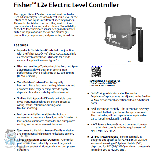 Fisher®L2和L2sj耐用型液位控制器使用浮子式浮筒液位傳感器來探測液位或兩種不同重力液體的分界面。可靠的設計讓這些控制器非常適合用于天然氣生產、壓縮和加工中的高壓液位應用。設備向控制閥發出氣壓輸出信號。傳感器使用螺紋式 2 NPT 接頭連接至容器。標準結構使用的材料符合 ACE MR0175-2002 的要求。
