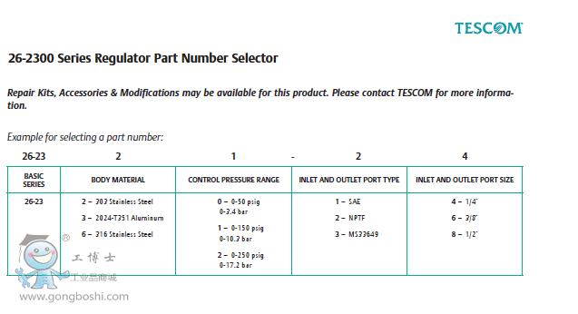 TESCOM 26-2300 Series is a highly accurate, diaphragm sensed backpressure regulator. It controls pressures up to 500 psig / 34.5 bar and offers many Cvs from 0.02 up to 1.0. Air and dome loaded versions are available for remote operation or for use with the TESCOM ER5000 Electropneumatic Controller for automation.