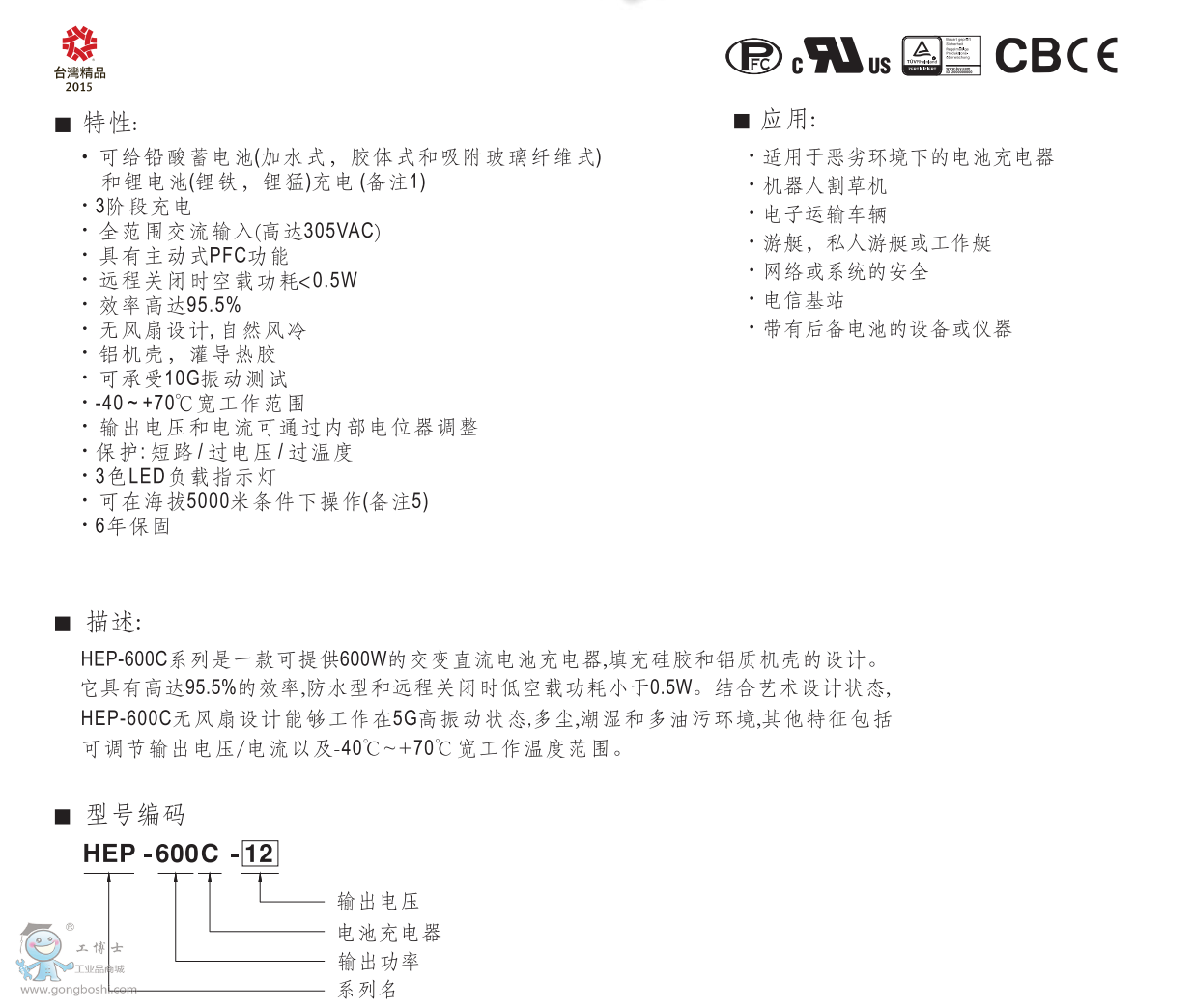 明緯電源HEP-600C-12 交變直流電池充電器 防水型 |