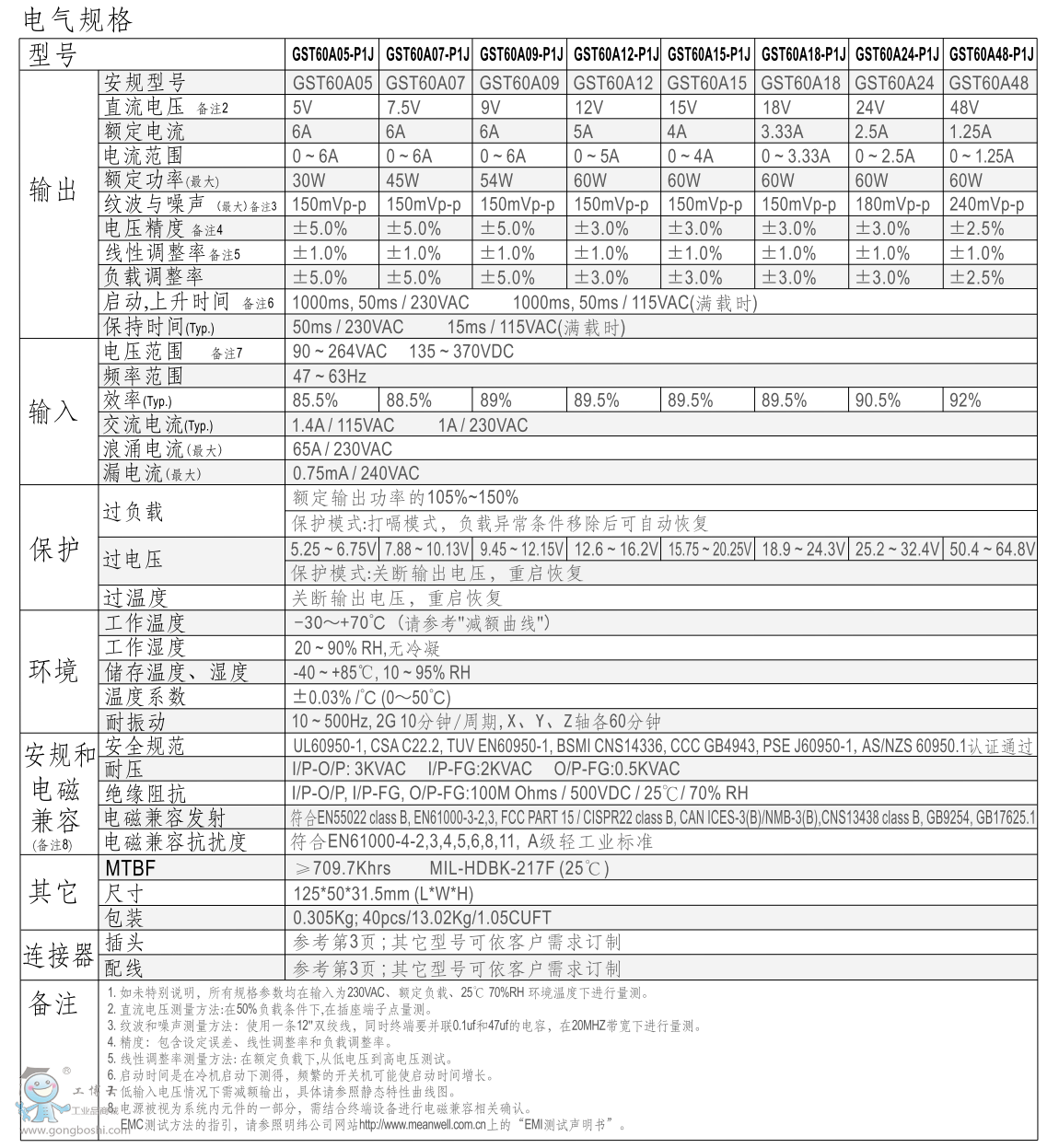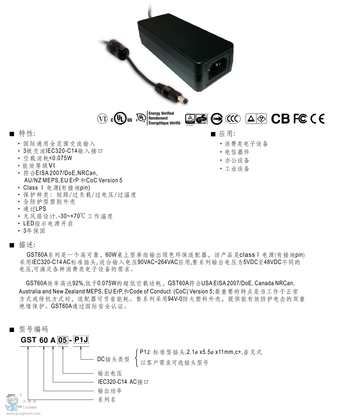 明緯電源適配器GST60A12-P1J標準DC插頭 |
