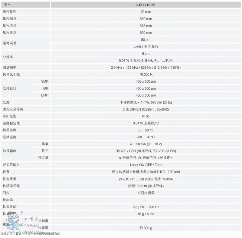 大量程激光位移傳感器optoNCDT 1710可以提供全球范圍內無與倫比的測量性能。測量范圍可達1,000mm。測量的起始點是距離傳感器1,000mm的位置, 這意味著1710可以測量*遠距離為2m的物體。控制器被集成到傳感器外殼內,從而使得不需要外部的處理電路。傳感器還具有自動的實時表面補光技術(RTSC)。 除此以外,內置的可調限位開關帶給該傳感器更大的靈活度。