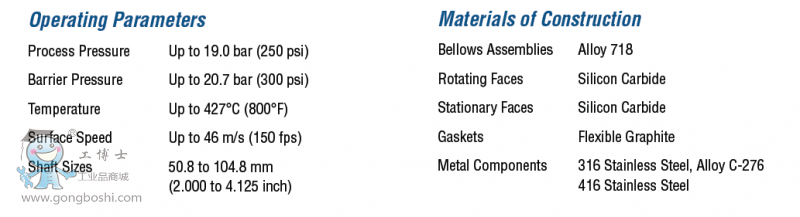 • Designed to operate without cooling and at full process temperature, the cartridge seal tolerates high axial overtravel during pump warm-up or thermal transients.