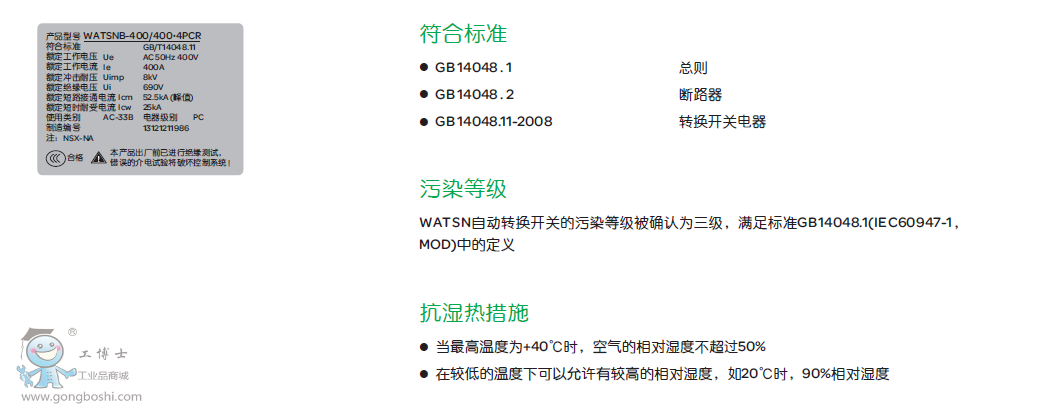 PC級(jí) :能夠接通、承載、但不用于分?jǐn)喽搪冯娏鞯腁TSE WATSN系列自動(dòng)轉(zhuǎn)換開(kāi)關(guān)若選擇不具有過(guò)電流脫扣器的負(fù)荷開(kāi)關(guān)作為執(zhí)行器則屬于PC級(jí)自動(dòng)轉(zhuǎn)換開(kāi)關(guān)。不具備保護(hù)功能,但其具備較高的耐受和接通能力,能夠確保開(kāi)關(guān)自身的安全,不因過(guò)載或短路等故障而損壞,在此情況下保證可靠的接通回路。