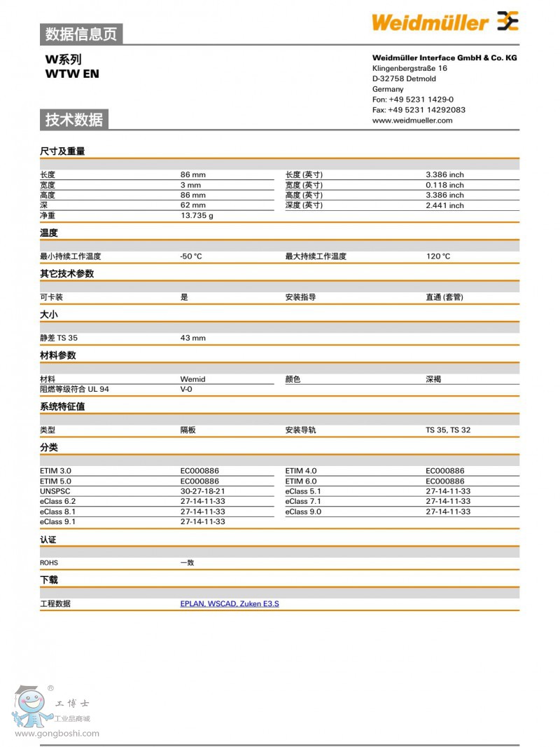 魏德米勒W系列隔板  WTW EN     訂貨號(hào):1058800000
