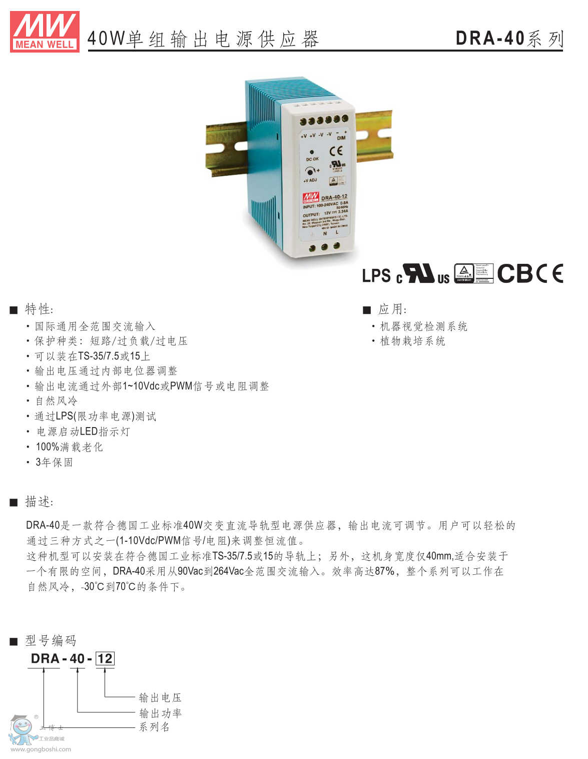 臺灣明緯導軌電源DRA-40-12 12V3.34A |