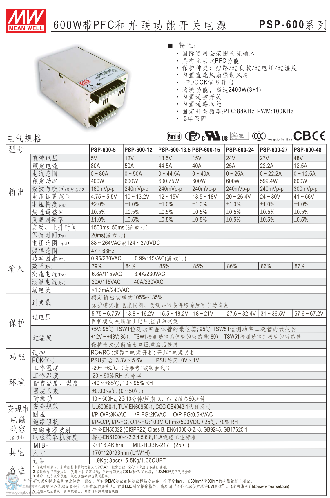 臺灣明緯開關電源PSP-600-48 600W48V12.5A可并聯PFC |