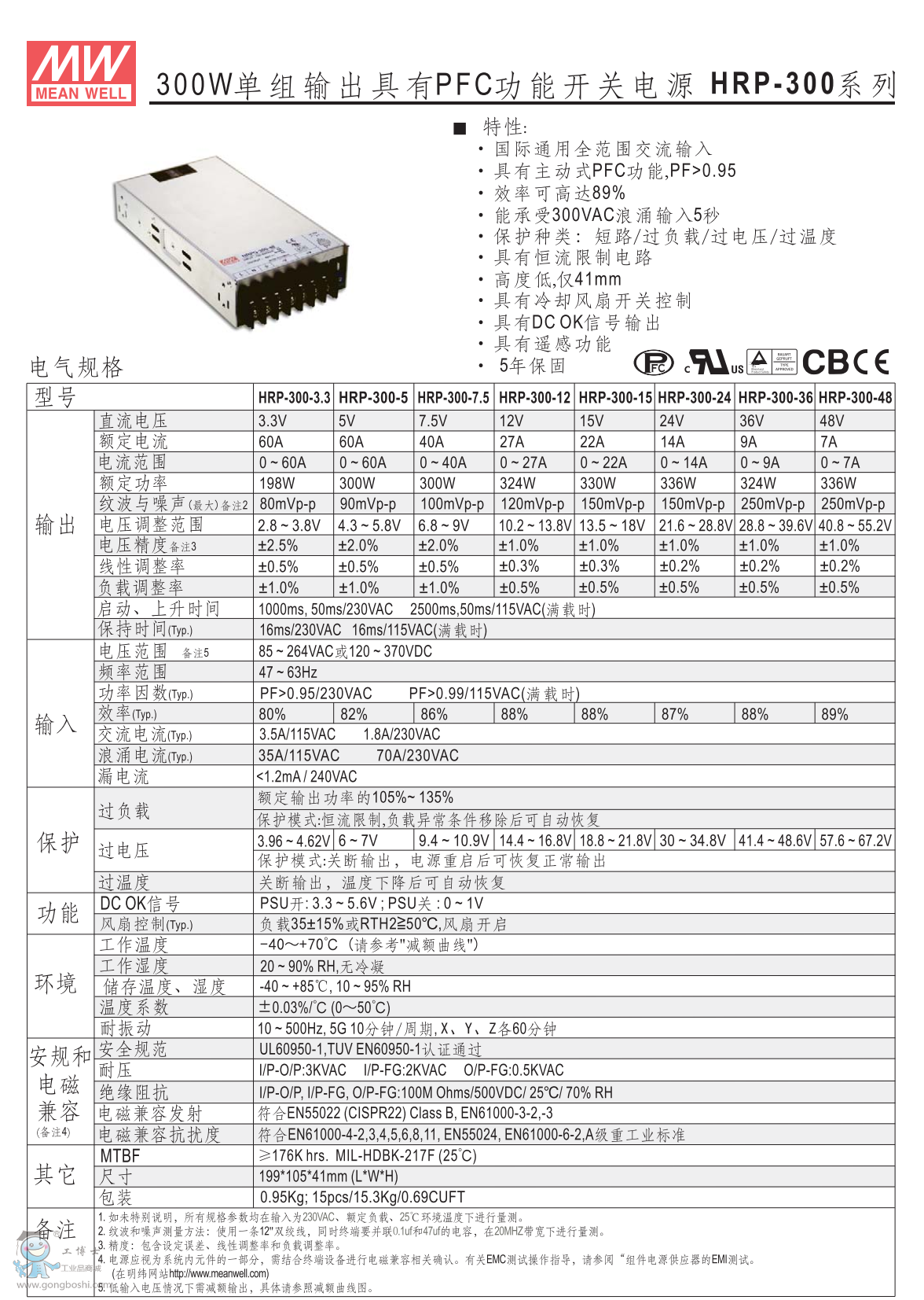 臺(tái)灣明緯HRP-300-12 12V27A單組輸出PFC功能開關(guān)電源 |