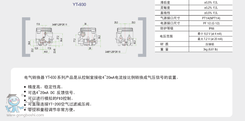 電氣轉換器YT-940系列產品是從控制室接收4~20mA電流信號,按比例轉換成氣壓信號的裝置。