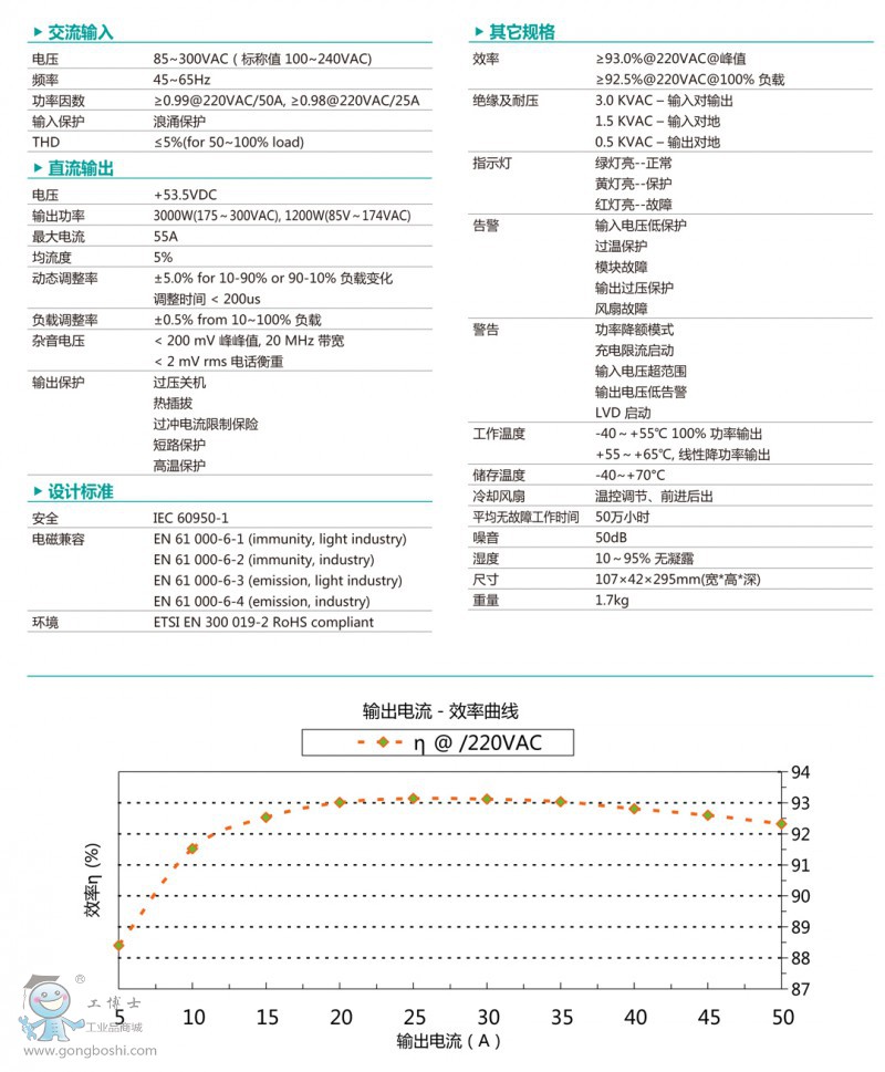 完全符合全球客戶對整流模塊高效率的要求,配合客戶的節能減排,降低運行電費。模塊滿足戶外降額標準,低電壓、高溫度全功率輸出
