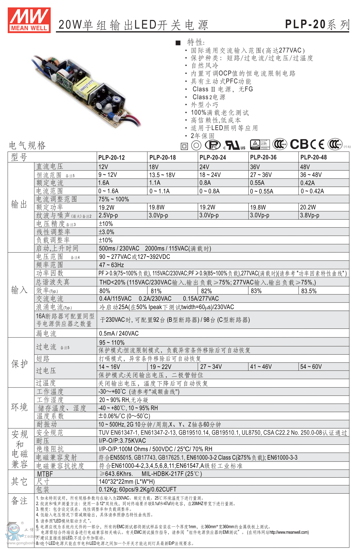 臺灣明緯LED開關(guān)電源PLP-20-36 20w36V0.55A |