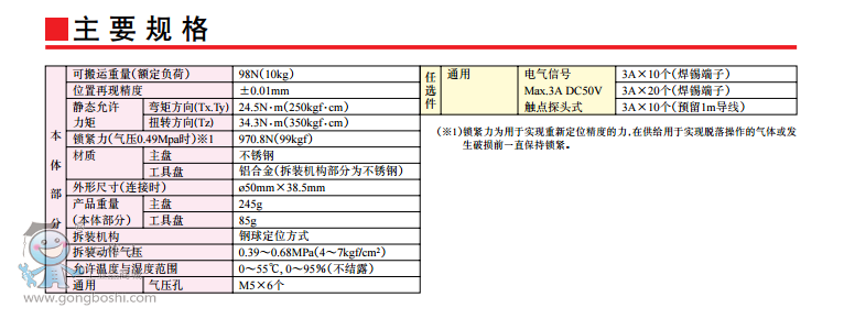 ●無接觸的吸合方式 裝配作業時,不會使主盤與工具盤接觸,通過這種吸合方式漠視偏心。 ●機械式故障保險機構 本公司獨有的拆裝機構中采用了機械式故障保險機構,使裝配氣壓停 止供給的情況下,主盤與工具盤也不會分離。