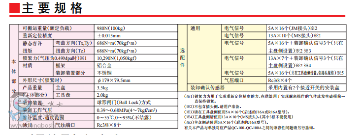 特點:為沖壓用途量身打造的外形設計 工具盤側面實施了兩面切割,可直立放置,節省了把柄的安放空間。 ●為沖壓用途量身打造的通用功能 標準裝備8根可在負壓下使用的氣壓端口(Rc3/8)。更可通過追加選配件,* 多裝備16根氣壓端口。 為工具盤添加了免接頭電氣信號接觸塊(R16A/B)這一選配件。通過直接焊 錫配線,實現免接頭(插頭)化,可避免配線插頭在把柄更換時發生破損。焊 接配線部位ID識別分配更容易,且安裝了用于保護模塊本身的金屬罩。 ●可將裝卸確認傳感器的輸出信號分配到電氣信號接觸 塊上。 可將主盤的裝卸確認傳感器(選配件)的輸出信號分配到2種電氣信號接觸 塊上。 ●機械故障保護裝置 采用本公司獨特裝卸裝置構成的機械故障保護裝置,即使停止供應安裝氣壓, 主盤與工具盤也不會脫離。