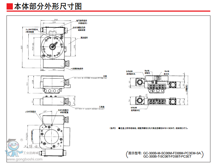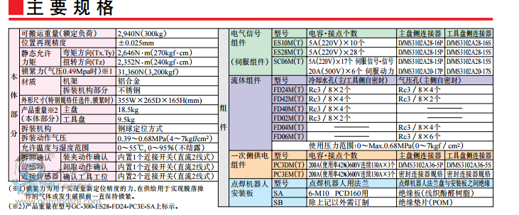 ●配線·配管由同一方向引出 為方便與點焊機器人的連接,將電源線、控制線、軟管的引出方向集中 為同一方向。 ●插入式伺服編碼信號連接模塊 伺服編碼信號的連接模塊采用了插入式觸點模塊,提高了編碼信號的 通電穩定性。 ●自密封型冷卻水孔 冷卻水孔的接觸部分為自密封型,并鍍有聚四氟乙烯,從而消解液體 滴留。 ●機械式故障保險機構 本公司獨有的拆裝機構中采用了機械式故障保險機構,使裝配氣壓停 止供給的情況下,主盤與工具盤也不會分離。