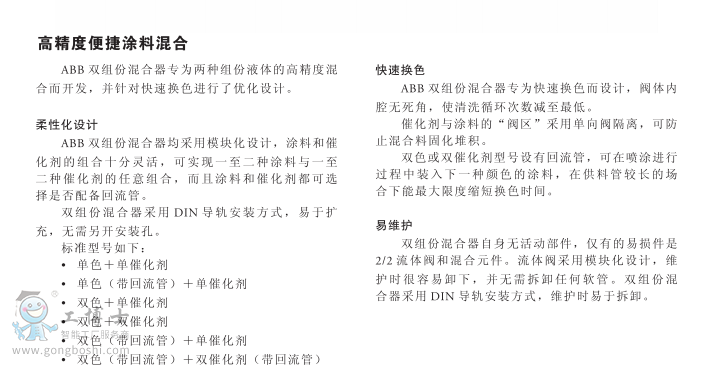 ABB雙組合混合器專為兩種組合液體的高精度混合而開發(fā),并針對快速換色進行了優(yōu)化設計。
