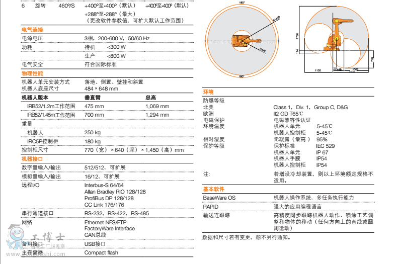 IRB 52體形小巧,工作范圍寬大,柔性與通用性俱佳,且其操作速度快、精度高,周期時間短。