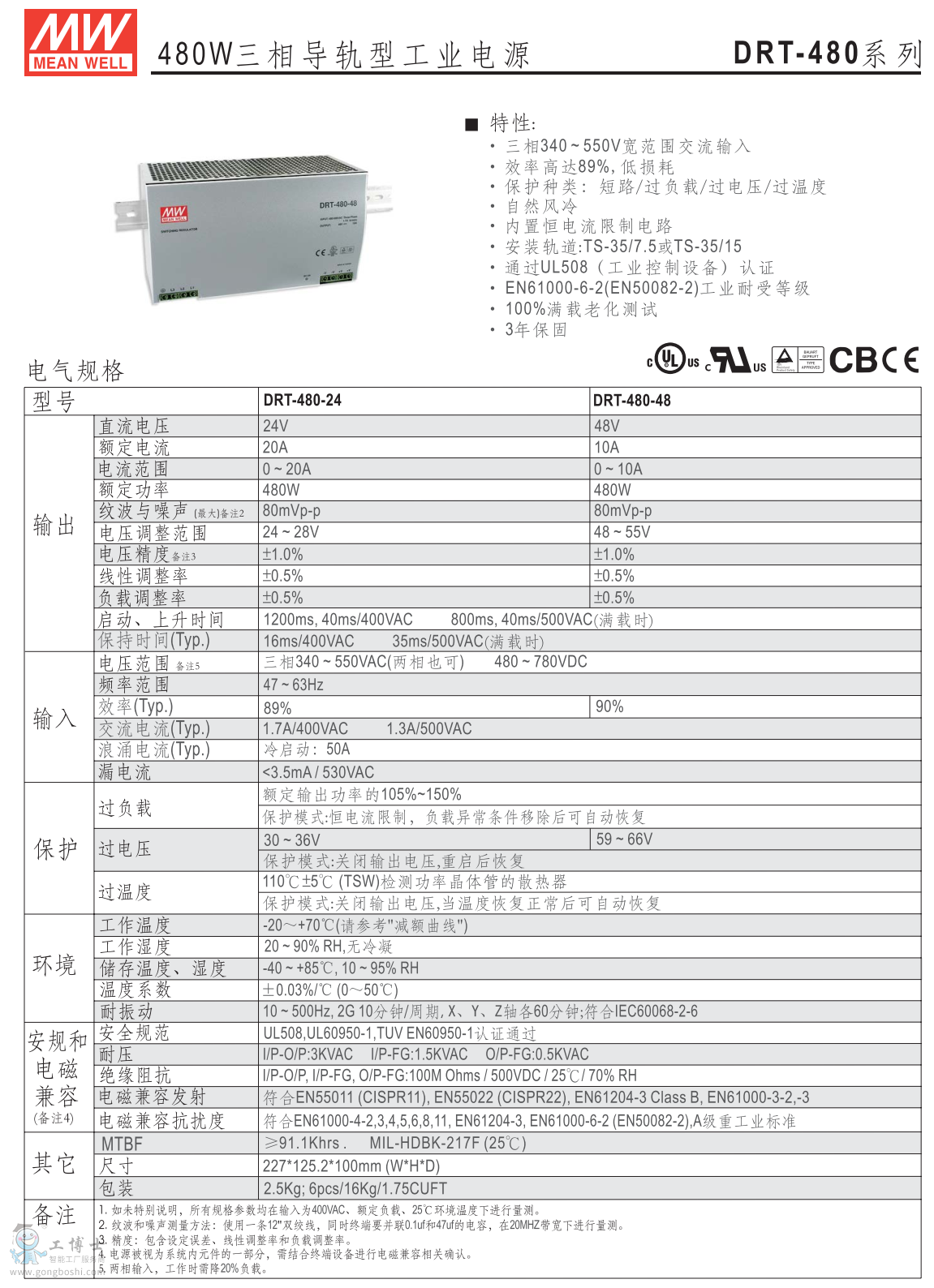meanwell臺灣明緯電源DRT-480-24 直流輸出24V20A三相導軌電源 現貨供應 |