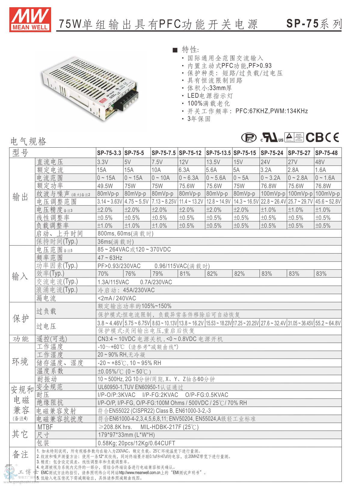 MW臺灣明緯開關電源SP-75-48 有PFC功能75W 48V 1.6A |