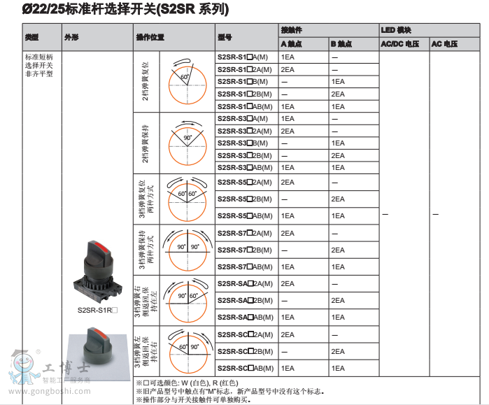 Ø22/25突出型短柄選擇開關S2SR-S3/5/7,觸點部位為可拆卸單元,擁有左右復位型,手動復位型,自動復位型3種動作方式。