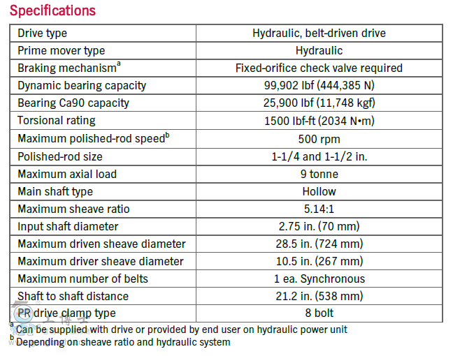 The Weatherford HTD-1500 drive is a hydraulic, belt-driven drive with a torque capacity of 1,500 lbf-ft. It is compatible with Weatherford stuffing boxes and various wellhead connections.