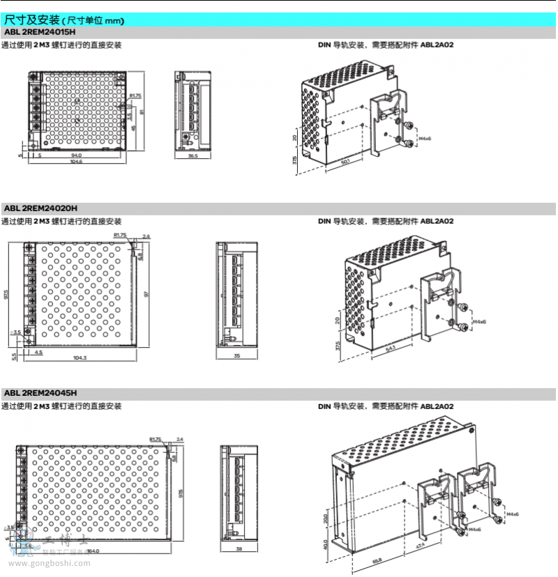 ABL2REM系列開關電源, 采用第三代開關電源設計技術,體積小巧,性能穩定,用于 向安全低壓的電氣設備提供必要的直流電源。此系列電源均能滿足標準商用設備中的 需求,均符合全球范圍的通行標準。作為設備組件,具有安裝容易的優點,適合不同 應用場合的不同安裝需求。 ABL2REM開關電源為全電子式,具備以下特點: p 體積緊湊、節約安裝空間(35W/50W/100W/150W) p 寬范圍輸入電壓(AC88-264V,DC110-370V,不同功率范圍有區別,詳見產品參數 表明細) p 輸出電壓穩定,可使用電位計調節 p 符合EN55022、B級標準 p 過載保護、短路保護、過壓保護、過熱保護(過熱保護適用于200-350W) p 所有型號均有標準導軌安裝附件匹配