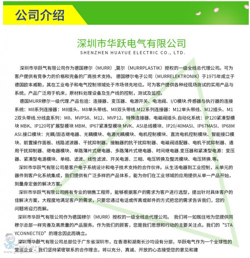 深圳市華躍氣有限公司作為德國穆爾(MURR)授權(quán)的一級全線總代理公司?蔀榭蛻籼峁┯懈偁幜Φ膬r格和完備的廠商技術(shù)支持。 德國穆爾電子公司(MURRElektronik)于1975年成立于德國歐本威勒,其在工業(yè)電子和電氣控制領(lǐng)域處于市場**地位?蔀榭蛻籼峁└鞣N經(jīng)現(xiàn)場測試的實用產(chǎn)品與系統(tǒng),產(chǎn)品廣泛用于機(jī)床,原材料處理設(shè)備及生產(chǎn)線的控制,測試及監(jiān)控。