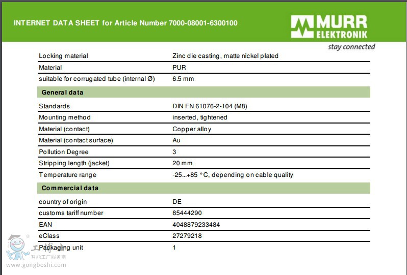代理供應(yīng)德國MURR穆爾連接器 電池閥 閥插頭7000-08001-6300100長期現(xiàn)貨