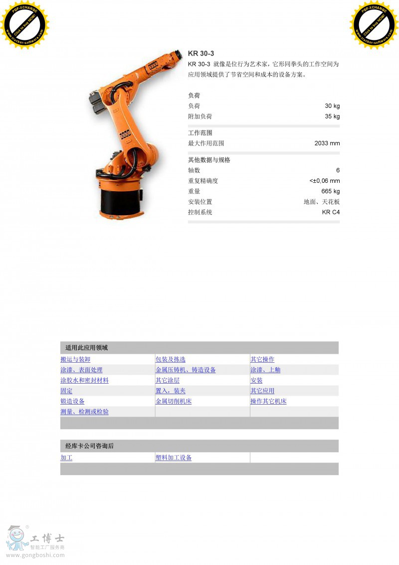 庫卡kuka機器人 KR 30-3 標準機型 負載30KG 臂展 2033mm |