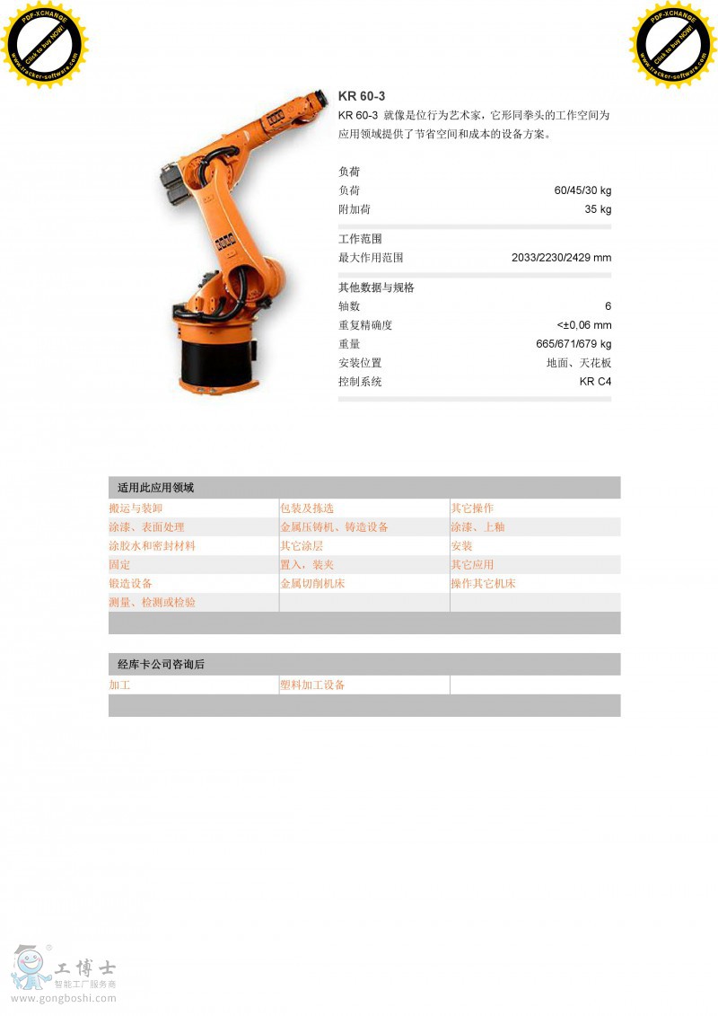 庫卡kuka機器人 KR 60-3 標準機型 負載60KG 臂展 2033mm |