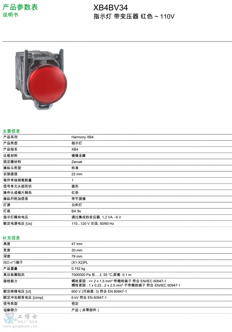 施耐德/Schneider 指示燈 XB4BV34 帶變壓器 紅色 110V