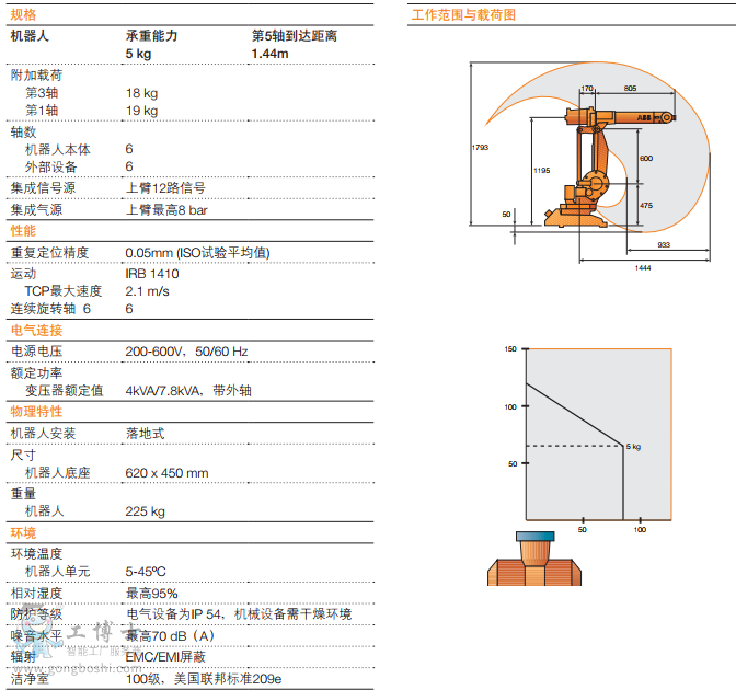 該機器人工作范圍大、到達距離長 (*長 1.44 m)。承重能力為5 kg,上臂可承受18 kg的附加載荷。這在同類機器人中絕無僅有。
