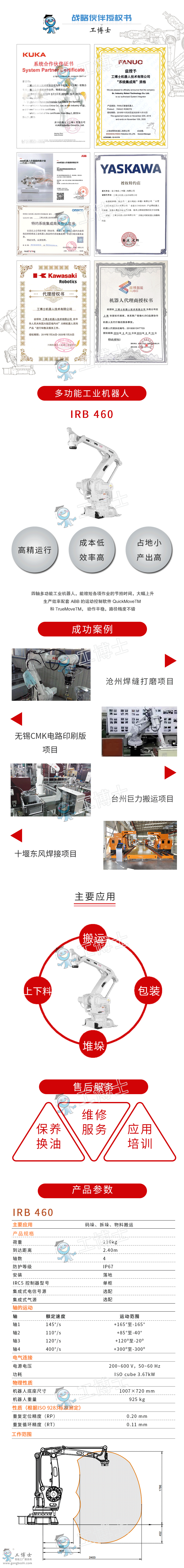 IRB 460機器人是由ABB提供的新型緊湊碼垛機器人,機器人本體重量為110公斤,機器人是全球*快的碼垛機器人,是高速碼袋、碼箱作業的**之選。