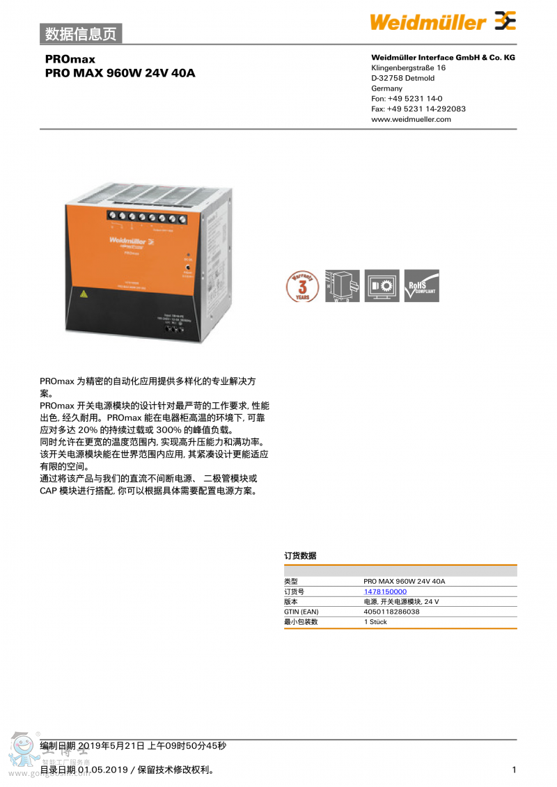 魏德米勒weidmulle開關電源PRO MAX 960W 24V 40A單相1478150000