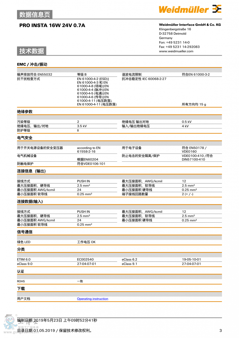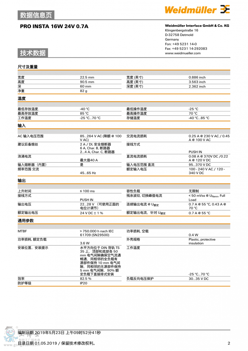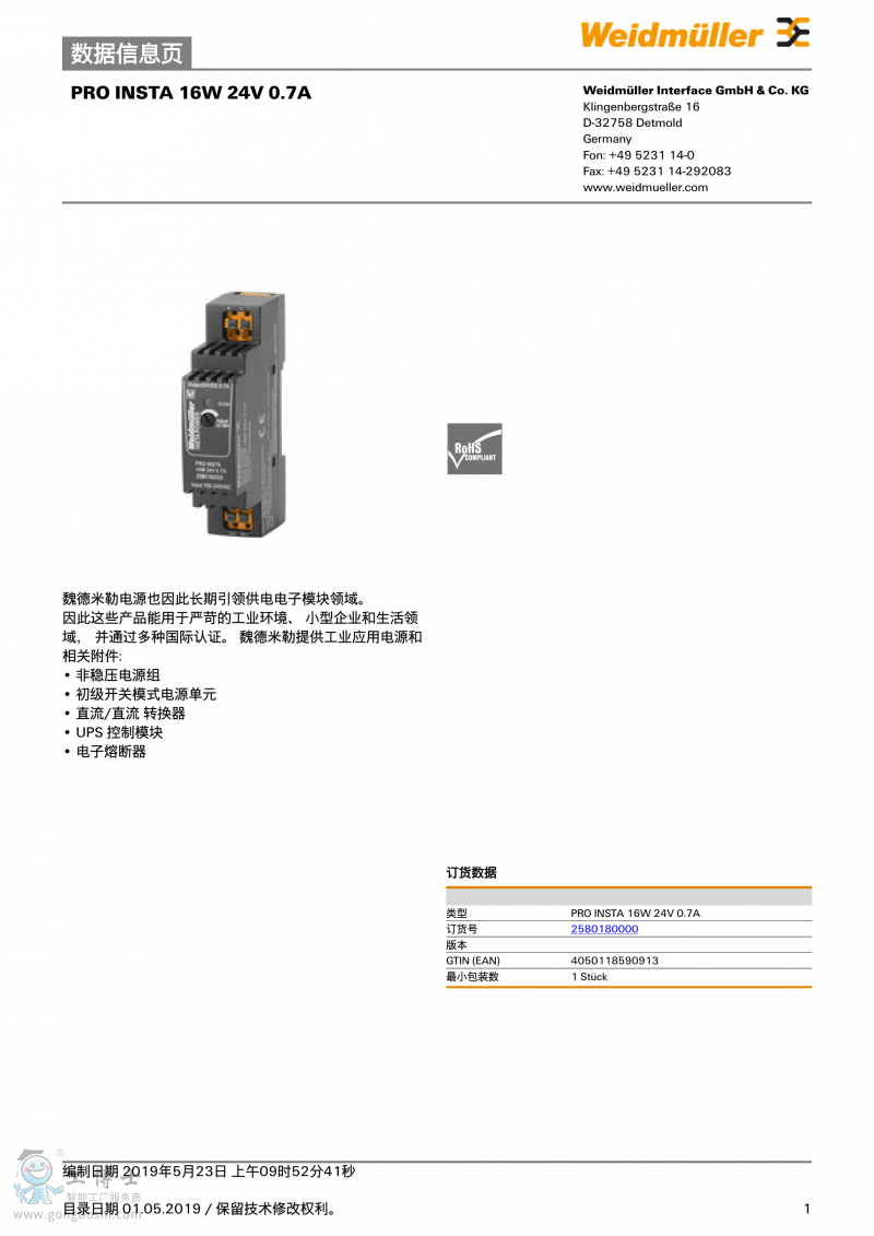 魏德米勒weidmulle電源PRO INSTA 16W 24V 0.7A/2580180000