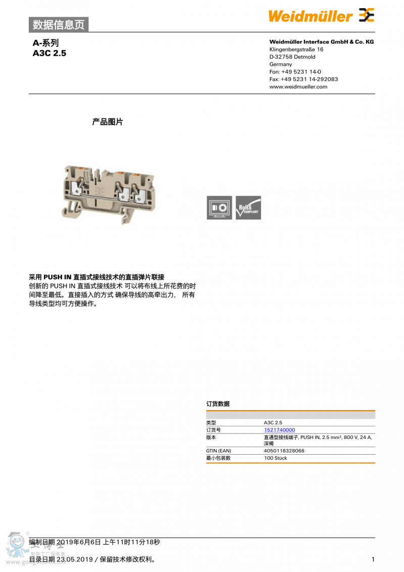 魏德米勒weidmulle直通型接線端子A3C 2.5訂貨號1521740000 |